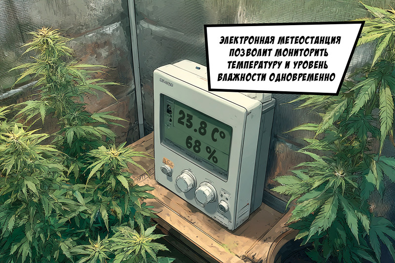 С градусником я думаю и так все понятно. Естественно нужен уличный, а не для измерения температуры тела. Гигрометр будет измерять влажность. Именно эти два климатических показателя являются ключевыми при выращивании конопли, ведь они напрямую влияют на процесс ее роста. Сегодня эти два прибора можно заменить одним – электронной метеостанцией. Они продаются практически во всех магазинах техники. Можете купить самую дешевую, главное, что она показывала температуру и уровень влажности.